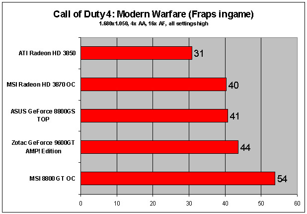 • Call of Duty 4: Modern Warfare, til trods for en forbløffende flot visuel fremstilling benytter Call of Duty 4 udelukkende DirectX 9. Vi har målt ydelsen ved hjælp af Fraps, hvor vi gennemfører en sektion af spillets første level. Det giver et meget håndgribeligt indtryk af ydeevnen, du kan forvente.
