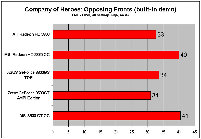 • Company of Heroes: Opposing Fronts, indbygget tidsdemo der illustrerer ydelsen (det gennemsnitlige antal skærmbilleder per sekund) i dette højst aktuelle DirectX 10-spil.