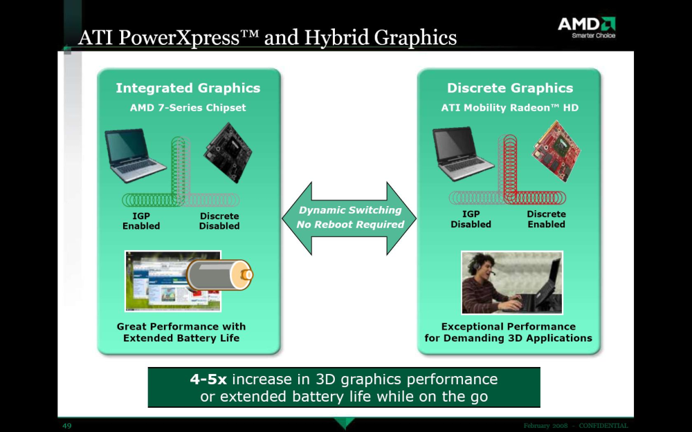 RS780M har indbygget et integreret grafikkredsløb, der ifølge AMD er op til fem gange mere ydedygtig end Intels X3100-løsning. Ud over understøttelse for HDMI, HDCP og DisplayPort er det ganske unikt, at de færdige bærbare pc’er vil kunne skifte dynamisk mellem at benytte den integrerede grafikchip og et selvstændigt grafikkort. Hiv strømkablet ud, og du har stadigvæk god grafikydelse på farten, uden at batterilevetiden lider et knæk.