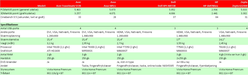 På skemaerne nedenfor kan du se specifikationerne for de enkelte bærbare computere i testen. Desuden kan du se vores bedømmelse af maskinernes sammensætning, samt hvordan de klarede sig i vores test.