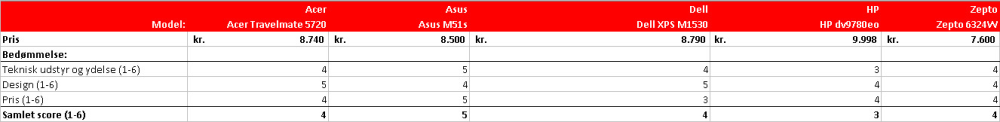 Vi har derfor samlet fem forskellige maskiner i mellemklassen fra kendte producenter som Acer, Asus, Dell, HP og danske Zepto. Maskinerne svinger mellem 2,5 og 3,5 kilo og mellem 7.600 og 10.000 kroner.