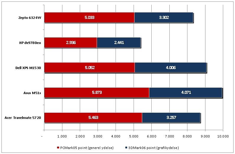 Alle de bærbare copmputere blev udsat for det komplette PCMark05-testforløb, hvorved vi kan danne os et overblik over maskinernes ydeevne ved afvikling af programmer, der sætter henholdsvis processor, hukommelse, grafiske kredsløb og harddisk under pres.
