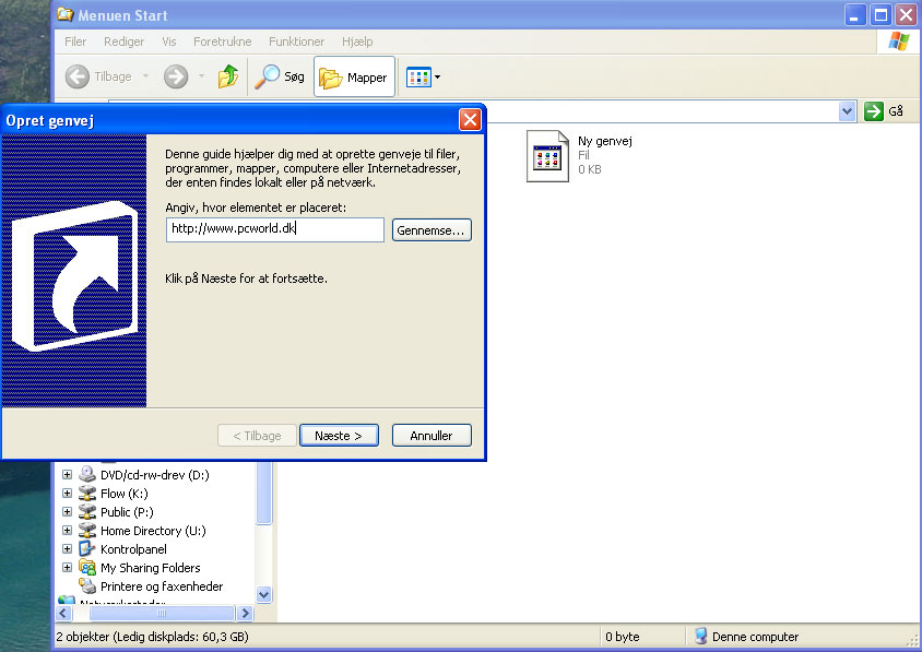 Så skriver du/indsætter det link, du gerne vil oprette en genvej til – for eksempel http://www.pcworld.dk – og klikker på ’Næste'.