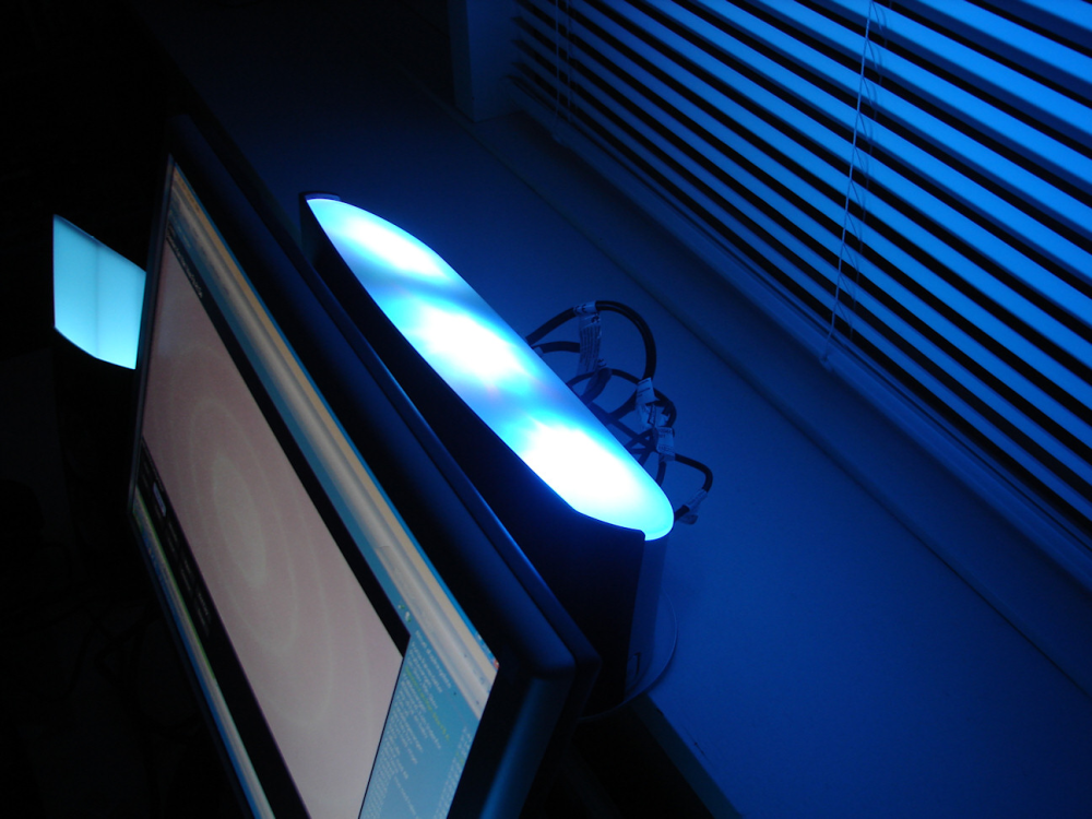 Boksen placeres bag skærmen, så den kaster kulørt lys op på bagvæggen. Det kræver naturligvis, at pc'en står op ad en væg, som helst skal være malet i en lys farve.