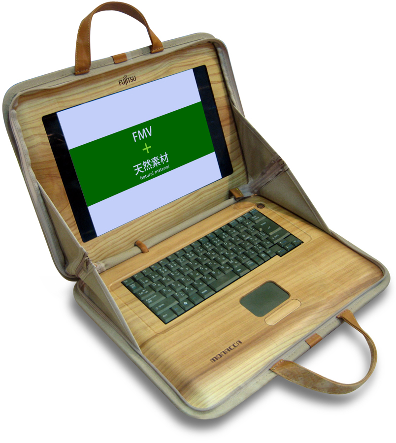 Den bærbare computer er blevet til i samarbejde med Monacca, der er et hold japanske designere med speciale i at benytte træ til forskellige produkter, blandt andet tasker.