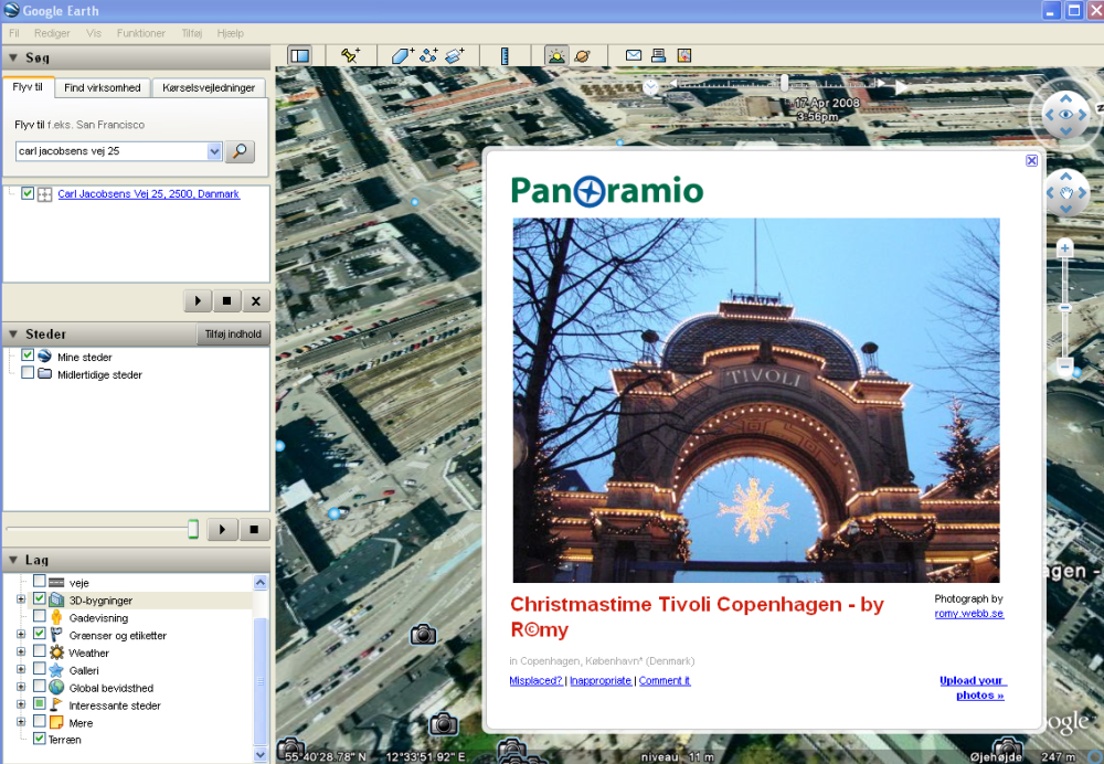 Som en lille ekstra feature byder Google Earth også på muligheden for at se, hvordan sollyset ændrer sig i løbet af dagen på bygninger og omgivelser.