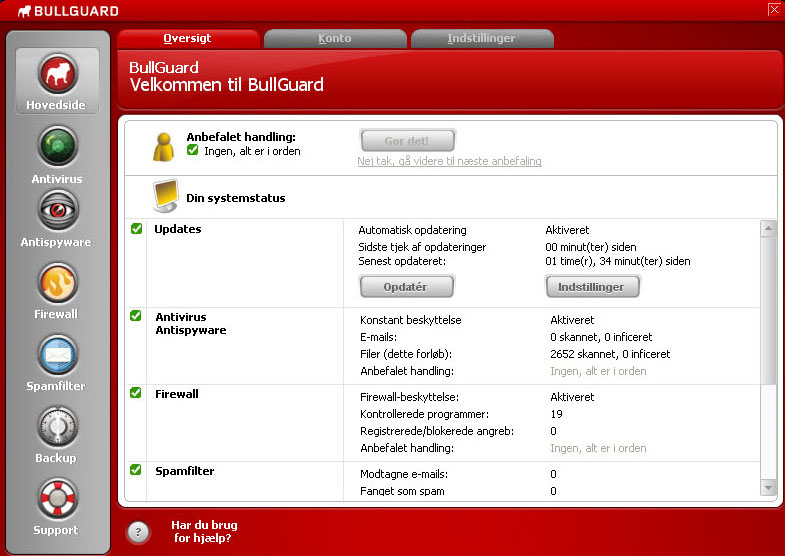 Standardfunktionerne er slået til fra starten samt spamfilteret. Bullguard er på dansk, og designerne fortjener en lønforhøjelse, for opsætningen og udseendet er en fornøjelse at navigere rundt i, og det letter betjeningen, at det hele er enkelt og lige til at finde ud af.
