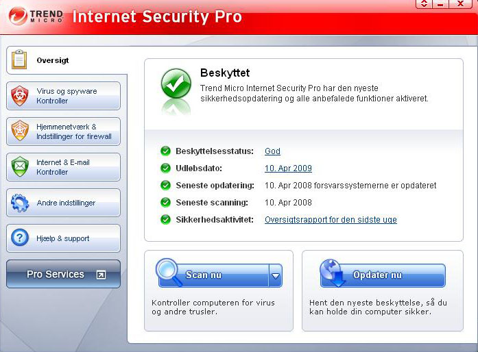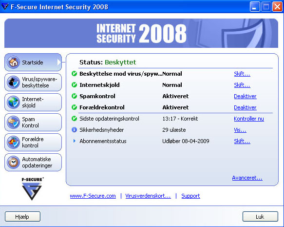 Startbilledet viser, om pakken kører, som den skal, og grønne symboler/grøn skrift gør det enkelt at se. Det hele foregår på dansk, og sikkerhedspakken bliver automatisk opdateret.