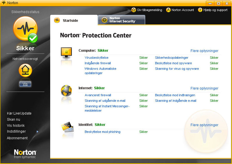 Startsiden i Norton Internet Security giver en oversigt over funktionerne, og om de er slået til. Alt er på dansk, og via startsiden kan du med et enkelt klik scanne hele computeren, men man kan desværre ikke se, hvor langt der er tilbage af en scanning, det savner vi.