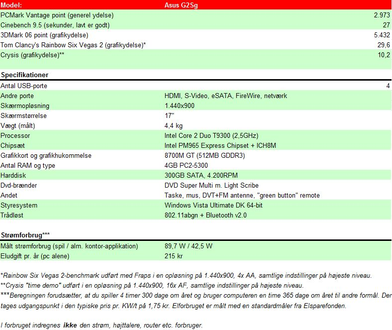 På den anden side har Asus G2Sg flere fortrin. Kølerens støjniveau er ret lavt, selv da maskinen måtte knokle for at køre det nye Tom Clancy’s Rainbow Six Vegas 2 med særdeles høje kvalitetsindstillinger, og den bliver kun varm på undersiden.