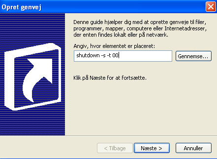 I vinduet skriver du: shutdown -s -t 00 og klikker på ’Næste’. Så giver du genvejen et navn og klikker på ’Udfør’.