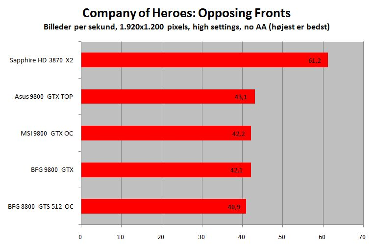 I Company of Heroes: Opposing Fronts er det påfaldende, at de to turbokort fra MSI og Asus næsten intet vinder. Forskellen er grænsende til ikke-eksisterende, og du vil ikke mærke den i praksis. I bedste fald vil du, ved at gå fra BFG’s standard-GTX til det dyreste fra Asus, se en ydelsesforskel på sølle to procent.