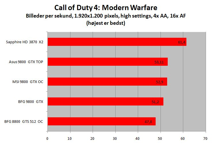 Call of Duty 4: Modern Warfare er også tæt på bedøvende ligeglad med de lidt højere frekvenser, og det er igen svært at finde argumenter for at hive 2.500 kroner op af lommen for en TOP-version. Historien gentager sig i store træk i Crysis og det syntetiske benchmark-program 3DMark Vantage.