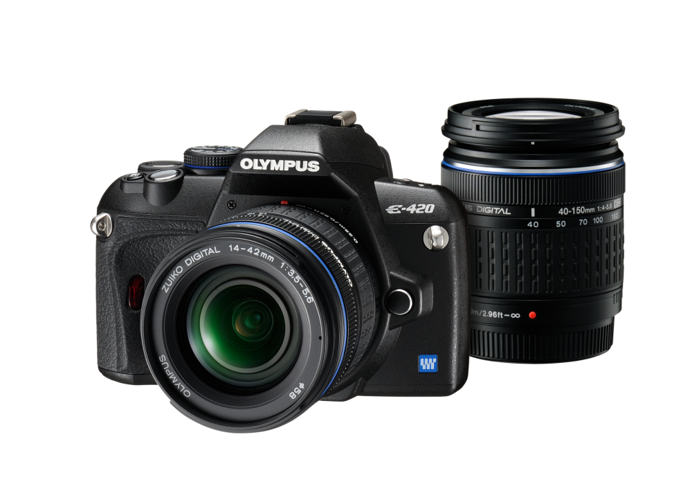 Olympus E-420. Olympus lancerede i marts det lille E-420 spejlreflekskamera. Du kan læse vores omtale fra lanceringen af E-420 her. Der er tale om en model med 10 megapixel opløsning og en fin 2,7 tommer skærm. Vi har set Olympus E-420 til 4.323 kroner. Til prisen får du en stor pakke med to objektiver: et på 14-42 og et på 40-150 mm.