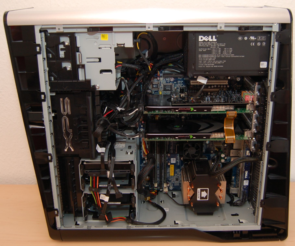 Der er vendt op og ned på bundkortet i forhold til de fleste desktop-pc’er, så kølerne på de to hårdhændede grafikkort er endnu mere synlige.