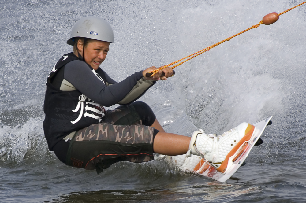 - Billedet er taget på den nyetablerede vandskibane i Hvide Sande, hvor løberen bliver trukket rundt i bassinet af et spil. Der er netop drejet i et sving, derfor ses det herlige skumsprøjt og koncentration for at holde balancen, fortæller Jørgen Tveen.