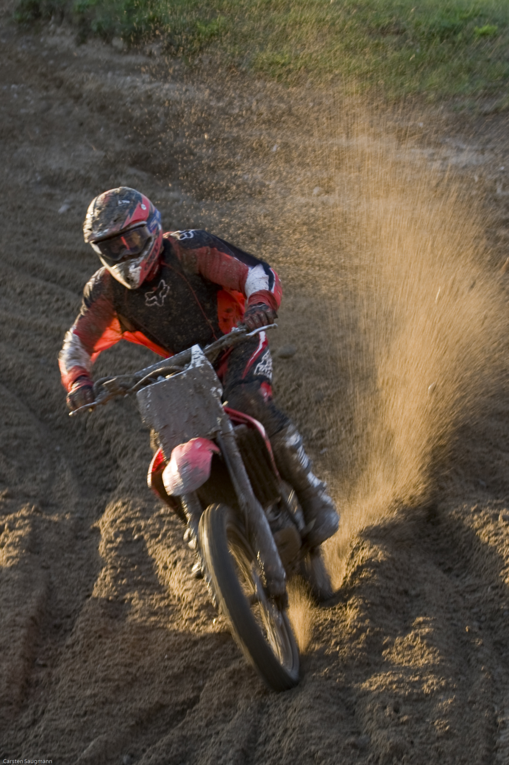 - Billedet er taget ved en afdeling af VM i motocross på banen ved Brusgaard ved Randers i august 2007. Her er brugt en forholdsvis langsom lukkertid for at fange bevægelsen og farten, forklarer Carsten Saugmann.