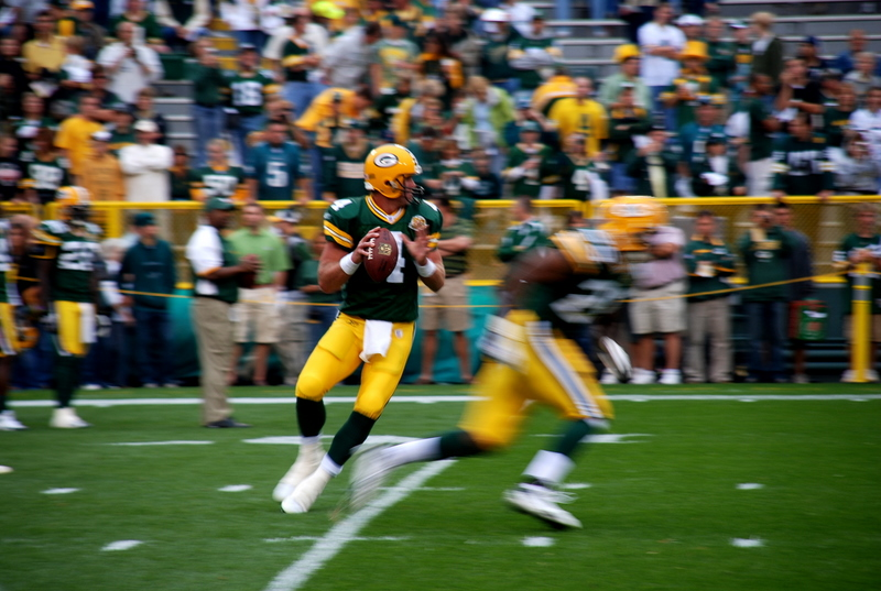 - Billede er taget den 9/9 sidste år og forestiller et ærkeamerikansk ikon; Brett Favre. Han spillede quarterback hos Green Bay Packers og er her fanget i sæsonens første kamp mod Philadelphia Eagles - en kamp som Packers vandt i de døende sekunder og blev startskuddet til en fantastisk sæson for Packers og en glorværdig afslutning for Brett, der spillede sin sidste sæson som kaptajn for holdet, fortæller Rasmus Kramer Schou.