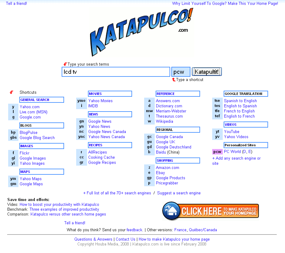Med katapulco.com kan du hurtigt bruge flere forskellige søgemuligheder og websider på nettet uden at klikke hen på hver enkelt side – og det kan være smart, hvis du vil researche på feriestedet – men også i mange andre situationer.