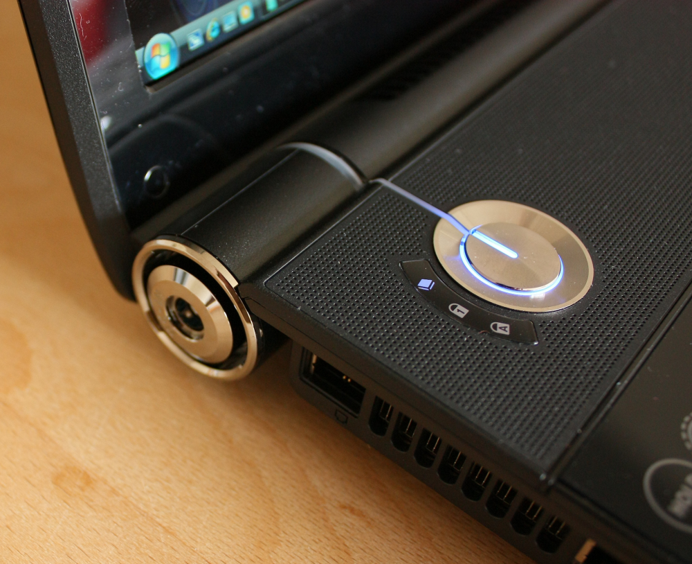 Over panelet sidder en sølvfarvet afbryderknap, der sender en blå lysstribe op til skærmen og videre ud til strømstikket, som er flot integreret i skærmhængslet.