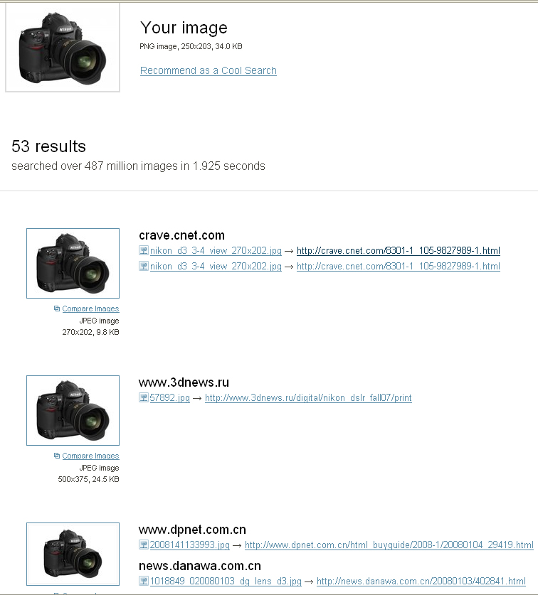 Herefter vil TinEye vise dig link til sider, der også indeholder billedet. Da det er et produktfoto, er det brugt på rigtig mange sider – oftest anmeldelser.
