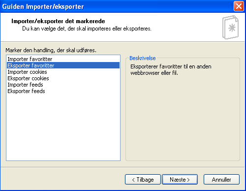 Klik på ’Filer’ og vælg ’Importer og eksporter…’. Klik på ’næste’ og vælg ’Eksporter favoritter’. Vælg derefter ’Foretrukne’ og derefter ’næste’.