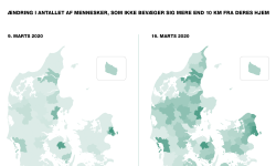 Mobilselskabet 3 er klar med overblik over, hvordan selskabets kunder bevæger sig rundt. Blandt andethar 3 registreret, at andelen af kunder, der bevæger sig mere end 10 kilometer væk fra deres hjem, er faldet drastisk.