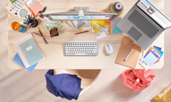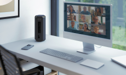 Netgears første wi-fi 7-router, RS700S, er pæn nok til at indgå i møbleringen af et stilbevidst (hjemme)kontor. Hvis producenten gør routeren tilgængelig i en hvid eller sølv finish, kan den blive et endnu bedre visuelt match for de lækre Mac-produkter på billedet. (Foto: Netgear PR)