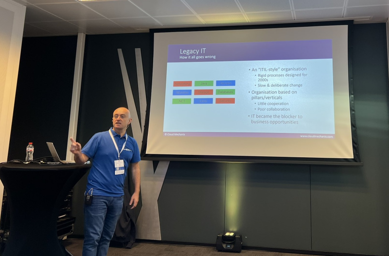 Finn forklarer, at flytning af virksomhedens virtuelle maskiner fra intern drift til skyen ikke automatisk vil resultere i besparelser. Det sker først, når organisationens gamle team-grænser nedbrydes og omformes – når IT og forretning arbejder sammen på nye måder, kommer gevinsterne.