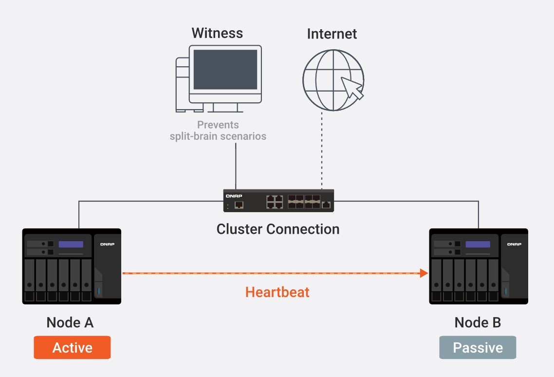 Opret en High Availability-klynge med to identiske QNAP NAS-enheder – den ene som aktiv server og den anden som passiv server. Hvis der opstår en uventet fejl eller et problem med den aktive server, giver den passive server øjeblikkelig beskyttelse med automatisk failover. Dette sikrer kontinuerlig storage-tjeneste og systemtilgængelighed.