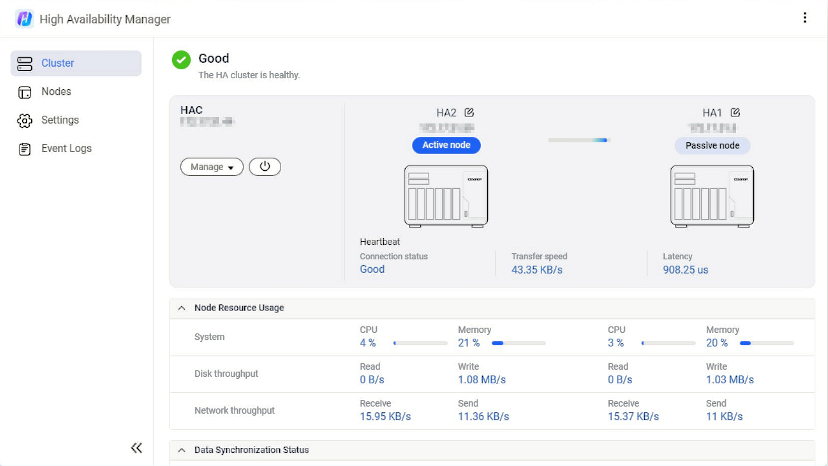 Med QNAP High Availability forbliver lagringen operationel selv efter hardwarefejl, og failovers håndteres automatisk uden manuel indgriben.