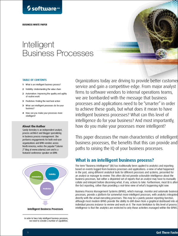 I dette white paper kan du læse om de centrale egenskaber ved intelligente forretningsprocesser, deres fordele og hvordan du hæver dine egne forretningsprocessers intelligenskvotient.