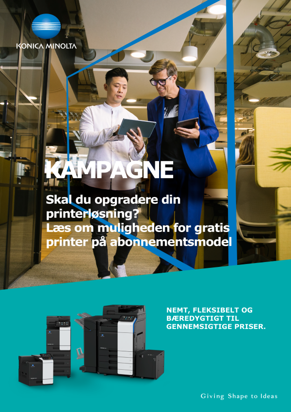 Nu kan du opgradere din printerløsning uden de store investeringer! Konica Minolta kan tilbyde dig en række moderne multifunktionsprintere – perfekte til kontoret – uden at du skal betale for andet end levering, installation og et fast årligt abonnement.